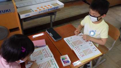 今日の算数の学習では,8はいくつといくつに分けられるかについて考えました。最初に数図ブロックで考えた後,2人1組になって,おはじきをつかって「8このおはじき」ゲームをしました。