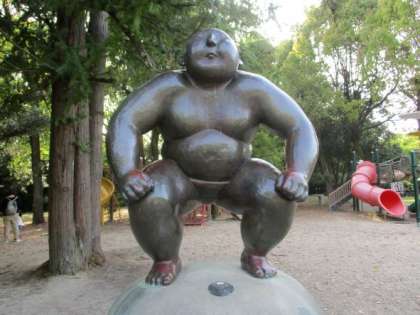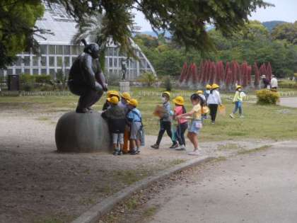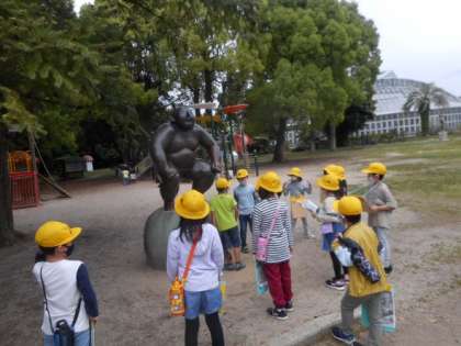 みらいくんの銅像前での様子です。遠足に行く前やみらいくんを見つけるまでは,みらいくんがどんなポーズをしているのか,いろいろな予想をしていました。発見した瞬間に「みらいくんってこんなんか!」「おもしろいポーズしている!」と予想が当たった児童もいれば当たらなかった児童もいましたが,みんな楽しそうにポーズのまねをしていました。
