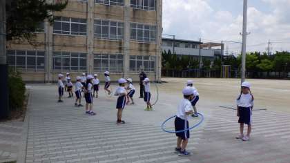 今日の体育は縄跳びとフラフープを使って遊びをしました。縄跳びでは前とびや後ろとびを,フラフープを使った遊びでは,体でまわしたり,縄跳びのようにとんだりしました。