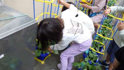 子どもたちは毎日水やりをして,朝顔の世話を頑張っています。今日は朝顔のつるが伸びてきたので,支柱を立てました。つるが伸びて,朝顔の花が咲くのが楽しみですね。