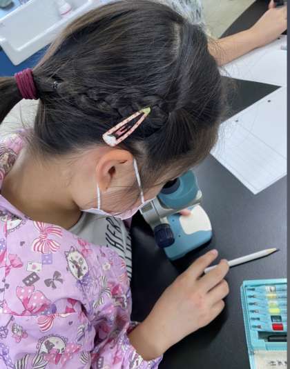 顕微鏡を使ってメダカの卵を観察しています。だんだんと育っていく様子が目に見えていのちの不思議に感動します。