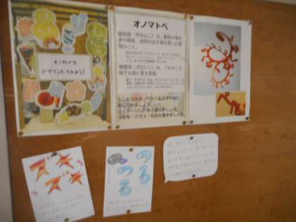 職員室近くの掲示板です。1学期には全校児童が応募してくれた俳句を貼っていましたが、今は「オノマトペ」の募集中ですオノマトペとは自然界の音・声、物事の状態や動きなどを音(おん)で象徴的に表した語です。子ども達は身の回りの「ゆらゆら」「ばたばた」等、身の回りオノマトペを探しています。