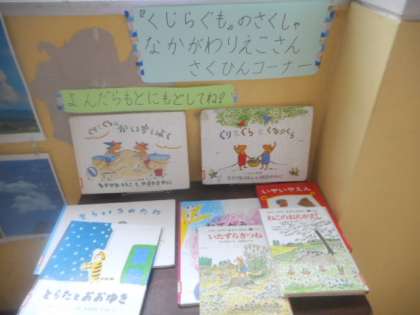 もう一つ1年生のろうかからの紹介です。くじらぐもの作者は中川りえこさんで「ぐりとぐら」を書かれた方です。他にも中川さんの作品が展示されていますので、色々な本を本でくれたらうれしいなと思います。
