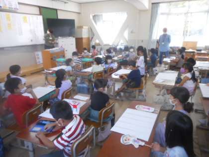 1年生のくじらぐもでは、ペープサート(割りばしに登場人物を付けたもの)を使って動きを実際に付けてみることで、子ども達が想像を膨らませやすいような工夫がされていました。