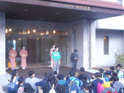 本日、宿泊をするベイリゾートホテル鳴門海月に到着しました。入館式を行い、ホテルの方から注意事項を聞いて入館です。