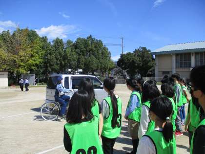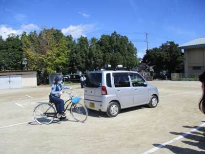 京都府南区警察署の方から、法規コースと技術コースの「スラローム」「一本橋」の自転車走行について、模範走行をしていただきました。街コースは、左右と後方確認を忘れないこと。技術コースは、自転車を乗るときのバランスのとり方などを教わりました。
