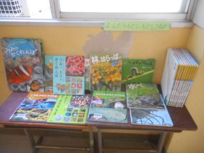 国語の教科書に出てくる「うみのかくれんぼ」に関係する本が並べられています。手に取って読んでみましょう。