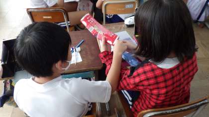 コンピューターの画像や牛乳パックの模型を使い、筋肉の仕組みを調べていきました。模型の際、「筋肉は腕の形によって筋肉の形も変わる。」「筋肉は上下にある。」などたくさんの気づきがありました。