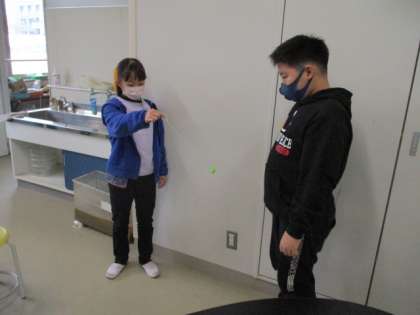 実際にふりこを動かしてみると,左右にいったりきたり同じような動きをする,など様々な気づきがありました。そして,音楽に合わせてみると…なかなかふりこの動きが音楽に合いません。