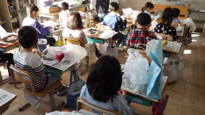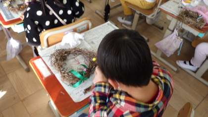 今週は持ってきた飾りをつかって飾りつけをしました。まつぼっくりやどんぐりなど,自然のものをつけたり,リボンやモールなどをつけたりして,一人ひとり個性のあるリースが出来上がりました。