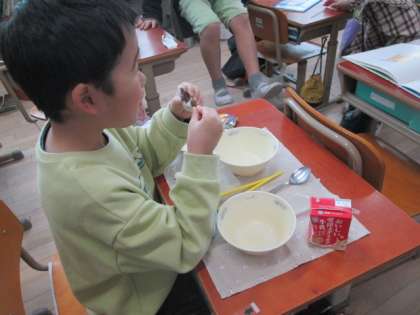 今日の給食に,さくらもちが出ました。朝から「今日の給食はさくらもちやで。」と楽しみにしていました。食べてみて「おいしい〜!」「ちょっとしょっぱかったけど,おいしかったわ。」「今日,買ってもらおうっと。」「生まれてはじめて食べたわ!」などの感想が聞かれました。