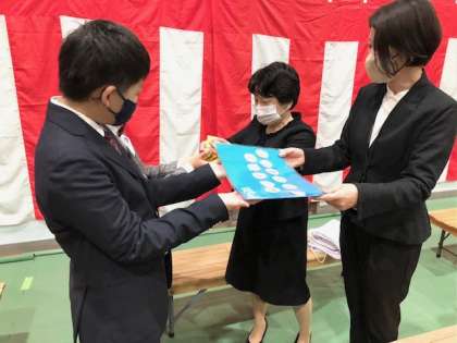 PTAから巨大卒業証書を贈らせて頂き、大勢の皆様の記念撮影に大好評でした。来年度以降も使って頂けますと幸いです。逆に子ども達からPTAへ手縫いのお守りとメッセージを頂き感動でした。ありがとうございます。