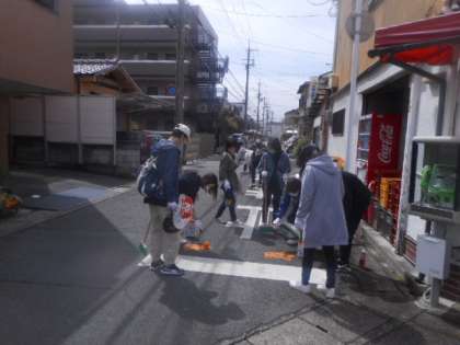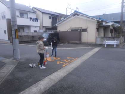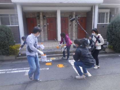 先日、新聞やインターネットで取り上げられた久世で半世紀以上続く「カエル描き」の取組ですが、本日はテレビ局が来ていました。会長を始め、作業をしている方もインタビューを受けていました。