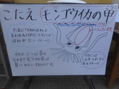 先ほどの問題の答えは、イカの甲でした。ある先生がイカを裁いたときのものだそうです。意外と大きくてびっくり。私たちが食べる前の過程では、色々なことしていただいているのだなぁと改めて感謝しました。