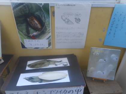 展示物の周りにはイカの本も置かれていました。本で学習することだけでなく、実物があると子どもたちもワクワクしますね。