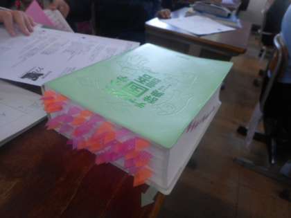 6年生が使っている辞書です。辞書を引くたびに見たところに付箋を貼っていました。言葉に興味をもつこと、自分で読んでみること。辞書には、新しい発見がたくさんかくされています。