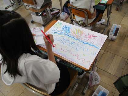 3年生、図画工作の「絵の具+水+ふで=いいかんじ!」の学習では、水彩絵の具と水で色々な色を作ったり、筆を使って様々な線を描き、自分の形を表したりすることができました。水の量で色の感じが変わったり、力の入れ具合で線の太さが違ったりすることの楽しさを感じることができました。