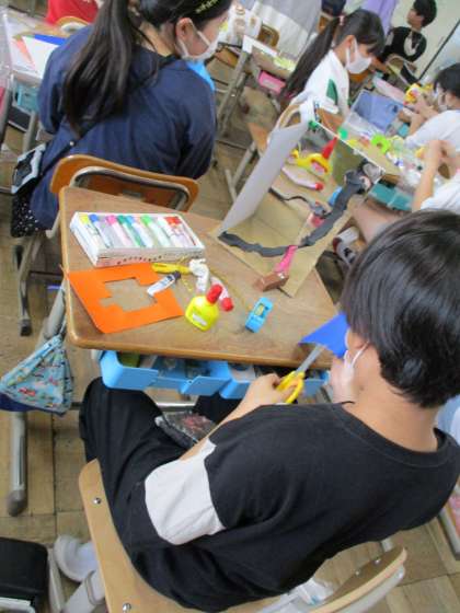 多くの子どもたちが、前の時間にステージを完成させ、今日は紙粘土や絵の具を出してきて、作品作りを進めていました。