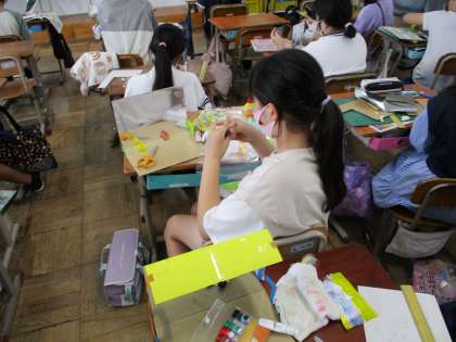 1時間目のアイデアスケッチが少しずつ形になってきて、目を輝かせながら作品作りに没頭する姿が見られていました。