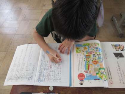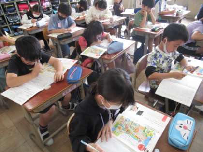 中には、文の中に会話文を入れている子もいました。みんなお話作りに夢中になっていました。