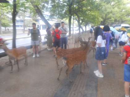東大寺までの道中、たくさんの鹿がお出迎え。鹿は鹿せんべいを持っている人に夢中でした。