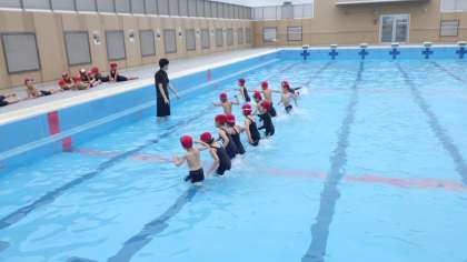 教室では、着替えの仕方、プールサイドでは足洗いや腰洗いやシャワーのしかたなどを確かめプールに入りました。