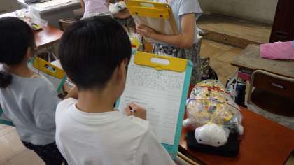 クラスの友だちの作品をじっくりみて、いいところをたくさん見つけていました。