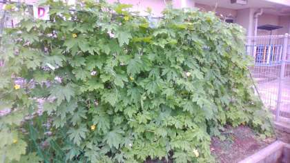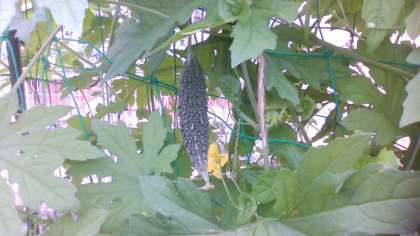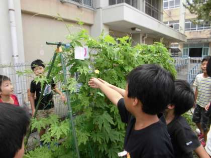 理科の学習で春に植えたツルレイシがぐんぐん伸びて,葉っぱも大きくなっています。小さいツルレイシの実も5〜6個できています。ツルレイシの実を見つけると