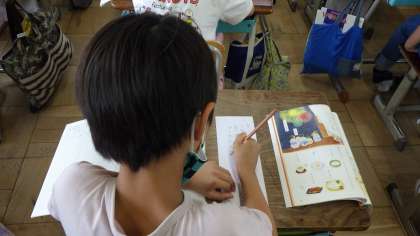 「夏のくらし」の学習では、夏の詩を音読したり、夏を感じる言葉をたくさん出し合ったりしました。