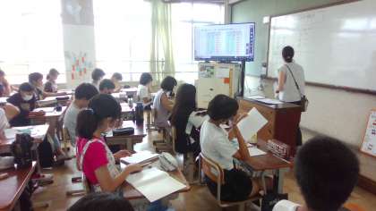 算数科「資料の調べ方」では、学習したドットプロットを見て、ちらばりの様子を表に整理しました。それをもとに気づいたことを発表し合いました。