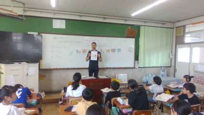 外国語の学習では、UNIT4「What time do you get up?」の学習に入りました。ALTのジェレミー先生と一緒に、1日の生活の言い方を外国語で言えるように練習して、最後にジェスチャーゲームを楽しみました。
