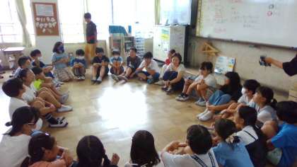 休み時間、本を読んだり外で思いっきり体を動かしたりと思い思いの時間を過ごしています。あるクラスは、休み時間にみんな遊びをしていました。今日は、ハンカチ落としだそうで、誰のところへハンカチが落ちるのかワクワクしながら、クラスの友だちと楽しく遊んでいました。
