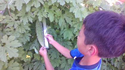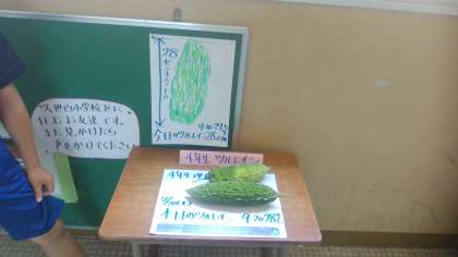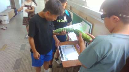 そのうちの一番成長が早くて大きい実を収穫しました。長さは28センチメートル。太くてつやがあって元気な実になりました。まだまだたくさん実ができているので、夏休み明けの観察も楽しみですね。