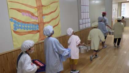 毎日の給食当番がんばっています。役割に分かれて食缶を運んでいます。