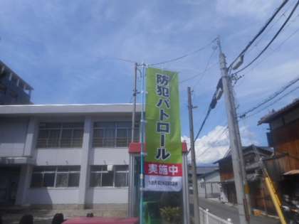 のぼりには、「防犯パトロール実施中」「安心安全まちづくり」と書かれています。こののぼりがあることで、さらに安心、安全の街になればいいなと思います。