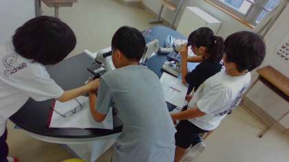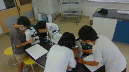 理科の学習では、アサガオの花粉を顕微鏡で観察しました。反射鏡の向きを変えて明るく見えるようにしたり、調節ねじを回しながらピントを合わせたりすることが難しかったようですが、上手くピントを合わせて観察することができました。
