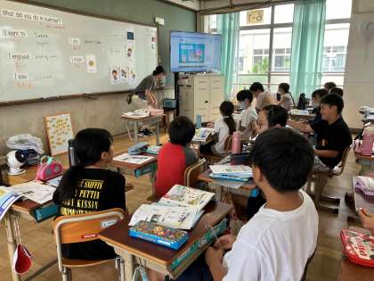 外国語科での学習では、夏休みにしたことやそこで見たものなどを話している映像を見て、聞き取ったことを書いたりチャンツをしたりしました。学習を通して、少しずつ新しい外国語にも慣れてきているようです。