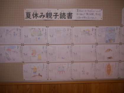 夏休み親子読書の校内掲示が完成しました。各クラス力作揃いで、どの本も魅力的でした。保護者の皆様、ご協力ありがとうございました。