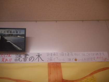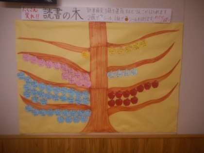 読書検定の取組の途中経過です。読書検定3級以上合格者は、りんごの中に名前が書かれてます。さらに、2級はシールが貼られ、1級は金色シールが貼られます。