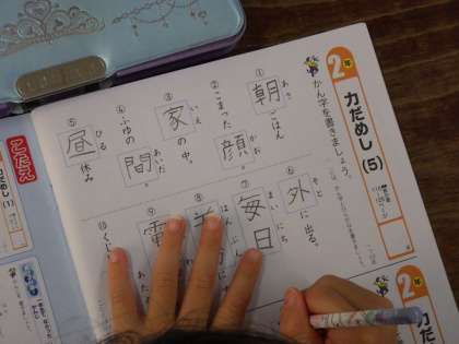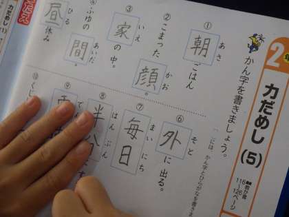 4月から子どもたちが新出漢字の学習に使用している、スヌーピーが表紙の『漢字学習ノート』の上巻が、書き込み学習を終えようとしています。