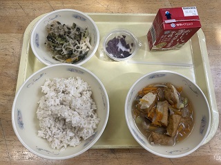 今日の献立は、麦ごはん、牛乳、厚あげの野菜あんかけ、切干大根のごま煮、しば漬です。