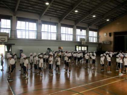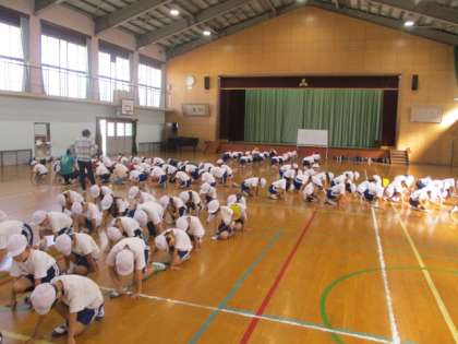 学年練習では、隊形移動の練習を行いました。自分の場所や移動した先の場所を覚え、最後には実際の位置で踊りました。