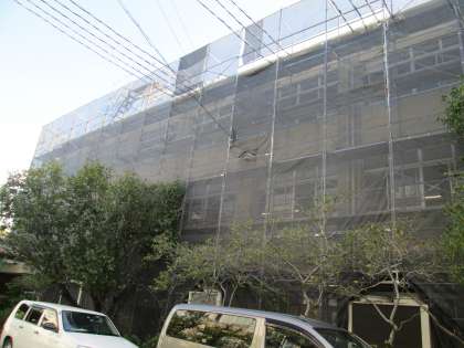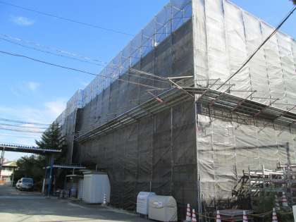先日お知らせさせていただきましたが、南校舎の外壁と屋上の防水改修工事が始まりました。連休の間に、校舎の姿がすっかり変わっていて、子どもたちも驚いているようでした。