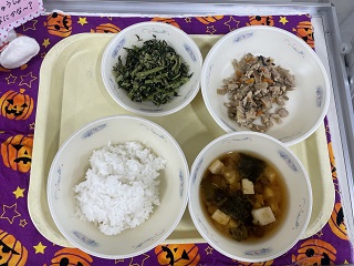 今日の献立は、ごはん、とりめし(具)、だいこん葉のごまいため、なめこのみそ汁です。今日は、10月の和献立の日です。