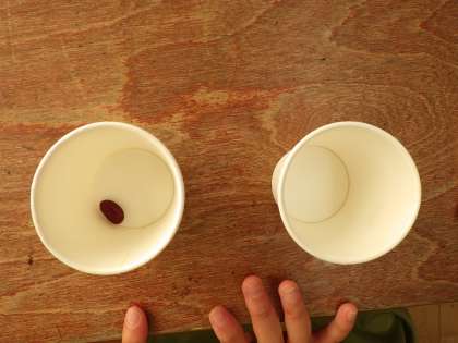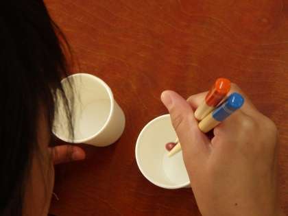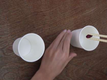 最後に、右側の紙コップに入れた金時豆をおはしでつかんで、左側の紙コップに移すことに挑戦しました。