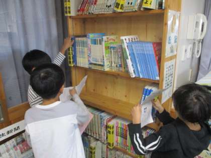 早速、休み時間を活用しながらクイズラリーに取り組みました。分類番号を意識して本を探すことを、普段の図書室での学習にも生かしていきたいですね。