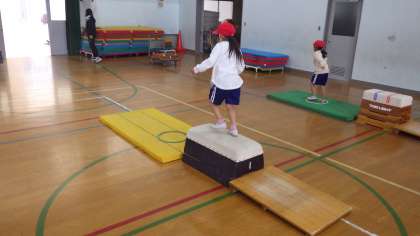とびばこあそびでは跳び箱の段を上げ、跳び箱の上に乗りマットにおりました。跳び箱の手の付け方や跳び方などを行いました。