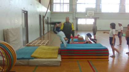 マット運動の学習ではいろいろな活動の場を作って、自分の挑戦したい場へ行って、練習をしています。段差を付けて倒立をしたり、前にボールや跳び箱を置いて、とび前転の「とぶ」感覚をつかんだりして活動を楽しみました。