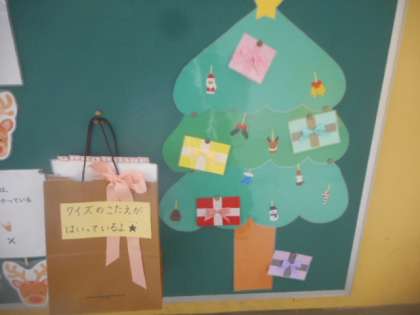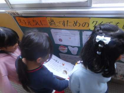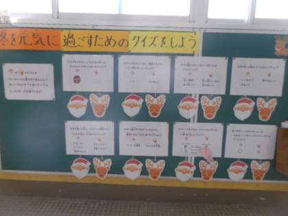 「冬を元気に過ごすためのクイズ」が保健室前の掲示板に貼られています。クイズは全部で8問あって、全部2択です。全問正解すると、正しい文章になります。「手を洗うときに大切なことは何でしょう」や「くしゃみをすると飛沫は何m飛びますか」など、楽しく学べるようになっています。最後には、サンタさんからクイズの答えと、元気に過ごすためのお手紙もあります。