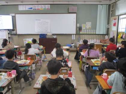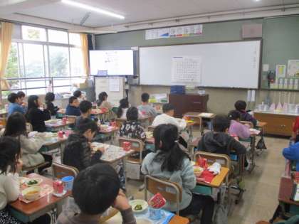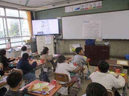 栄養教諭が作った動画も見ながら、食への関心を高めています。2年生がスタートしたころと比べて、たくさん食べることができるようになった人もいるようです。